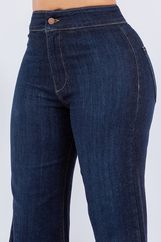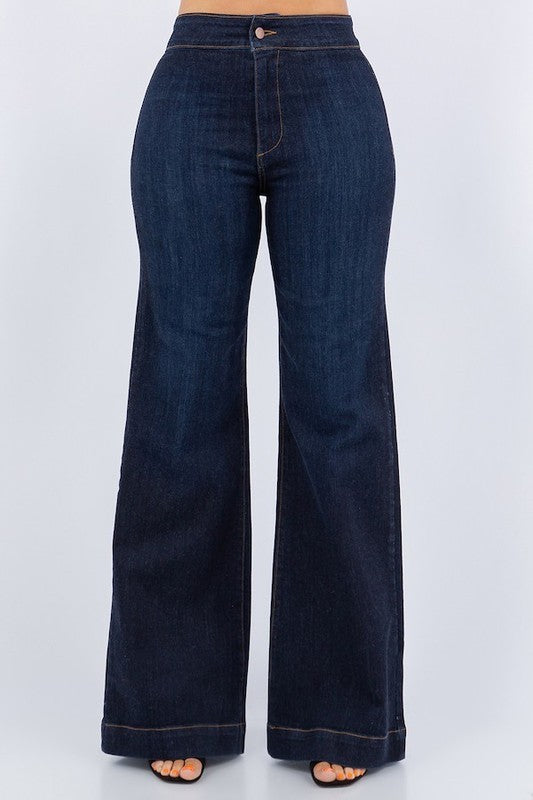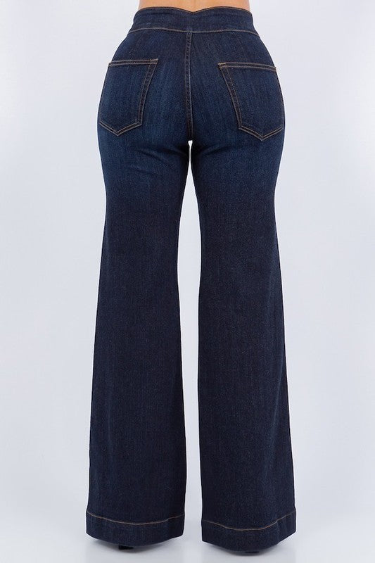 Get ready to meet your new favorite jeans: the Harley Wide Leg! Combining style and comfort like never before, these denims feature a stretchy heavy 11 oz premium fabric, a wide waistband, and a unique dark wash. With a front button and zipper closure, back pockets, and a wide hem detail, these jeans have it all. Best part? They're made right here in the USA and come in a perfect 34\" inseam. Say hello to your new go-to jeans!