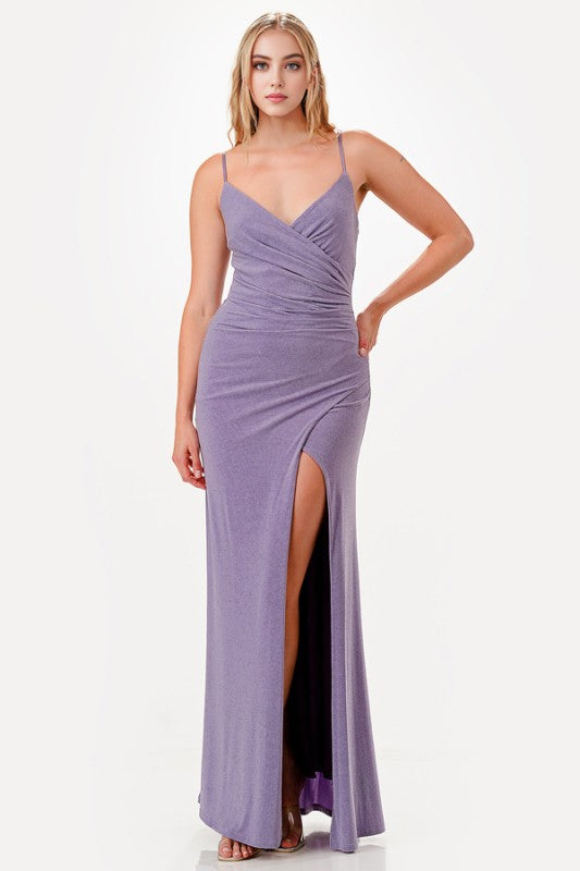 Glitter ITY tara side pleat overlap gown with side openingMade In: USASize Measurement (inch): S: (Bust), (Waist), (Hips), (Length) M: (Bust), (Waist), (Hips), (Length) L: (Bust), (Waist), (Hips), (Length) XL: (Bust), (Waist), (Hips), (Length)