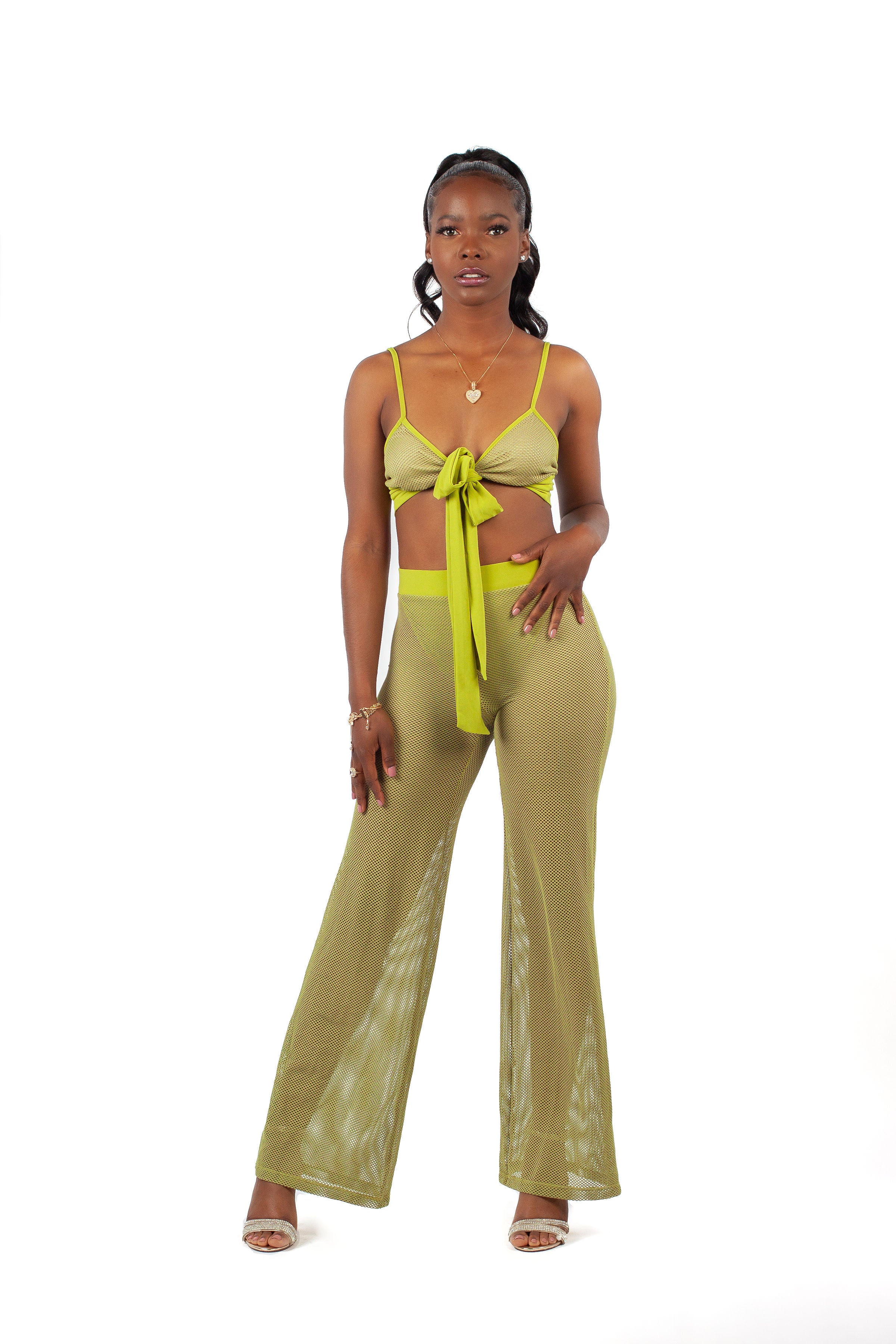 A bold two-piece mesh pant set designed to stand out. This outfit features a layered fishnet bikini-style top with a dramatic self-tie front bow and matching mesh pants with built-in bikini bottoms.
